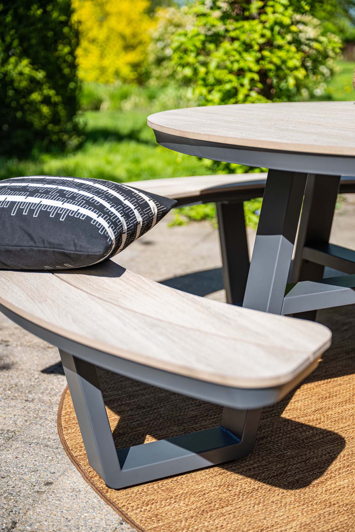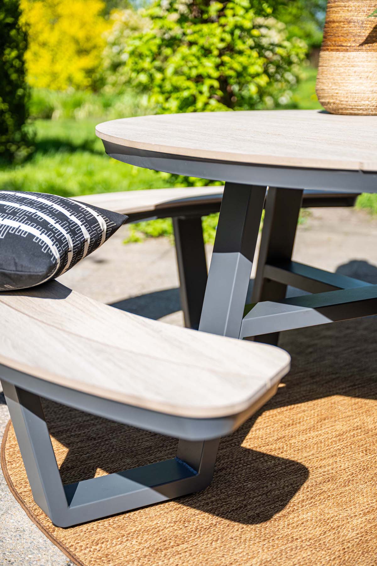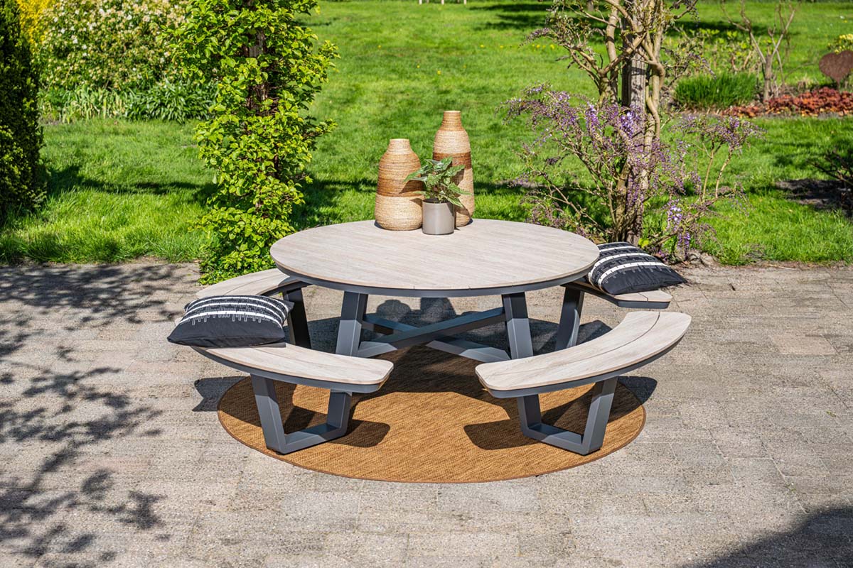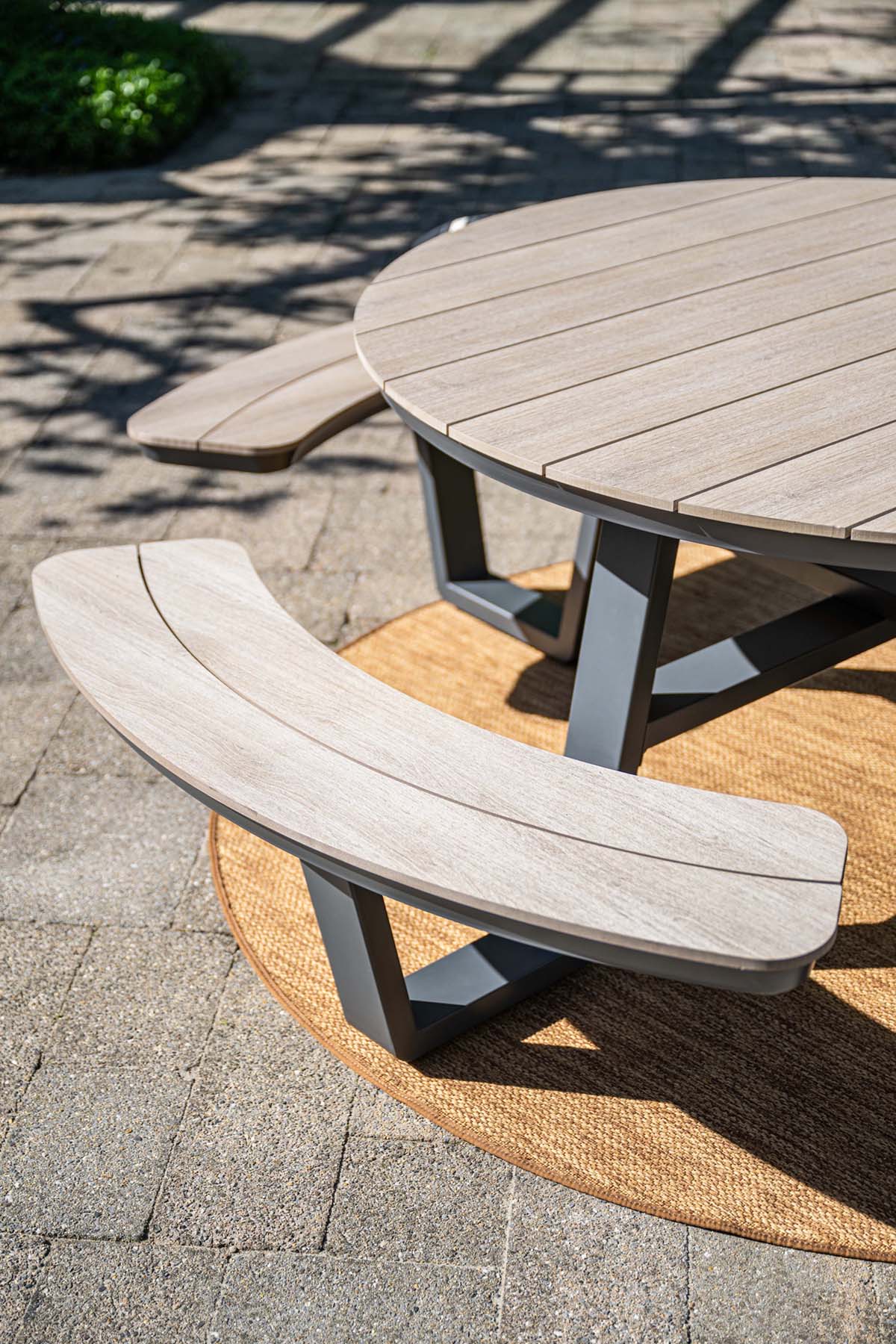De Garden Impressions Bell ronde picknickset brengt mensen samen in stijl. Dankzij de ronde vorm, het sterke aluminium frame en het onderhoudsarme Vironwood geniet je elk seizoen van comfort, duurzaamheid en een sfeervolle uitstraling in de tuin.