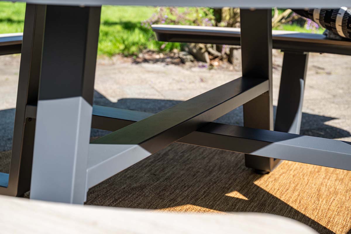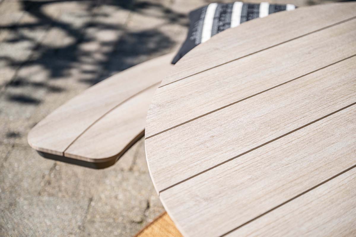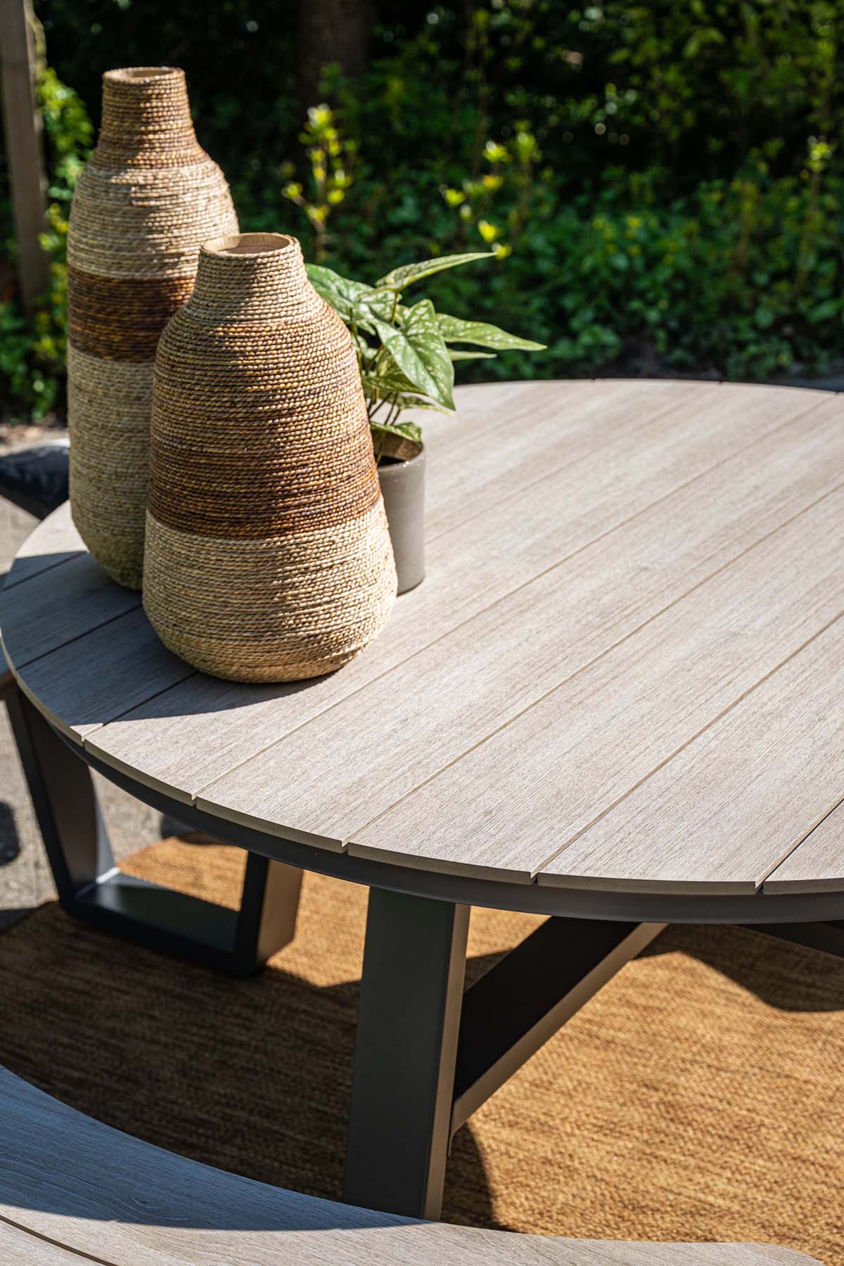 Het tafelblad en de vaste zittingen zijn vervaardigd uit Vironwood, een stevig kunststof materiaal dat nauwelijks te onderscheiden is van echt hout. Vironwood heeft de warme uitstraling van hout, maar is weerbestendig, kleurvast en eenvoudig schoon te maken.