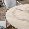 Het ronde tafelblad is gemaakt van Vironwood, een hoogwaardig kunststof met een realistische houtnerfstructuur. Zo geniet je van de warme uitstraling van hout, zonder het onderhoud dat echt hout vraagt.