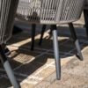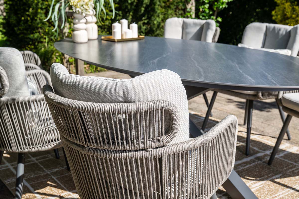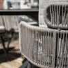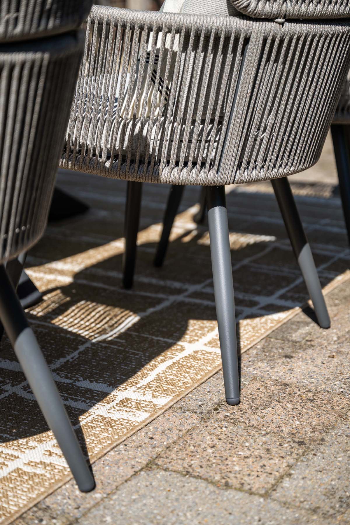De arm- en rugleuningen zijn met de hand omvlochten met hoogwaardig rope van solution dyed polyester – een materiaal dat kleurvast, sterk en weersbestendig is. Hierdoor blijft de stoel seizoen na seizoen mooi, zonder dat u er veel omkijken naar heeft.