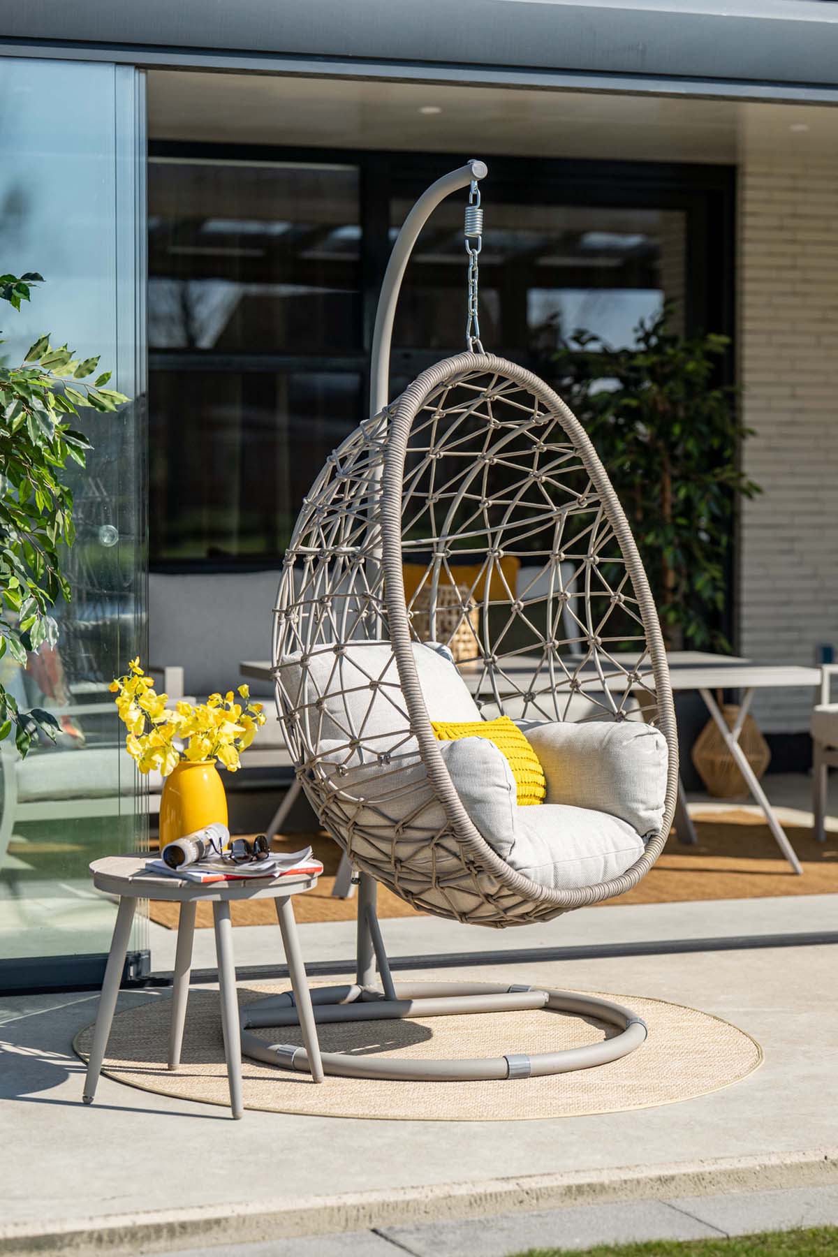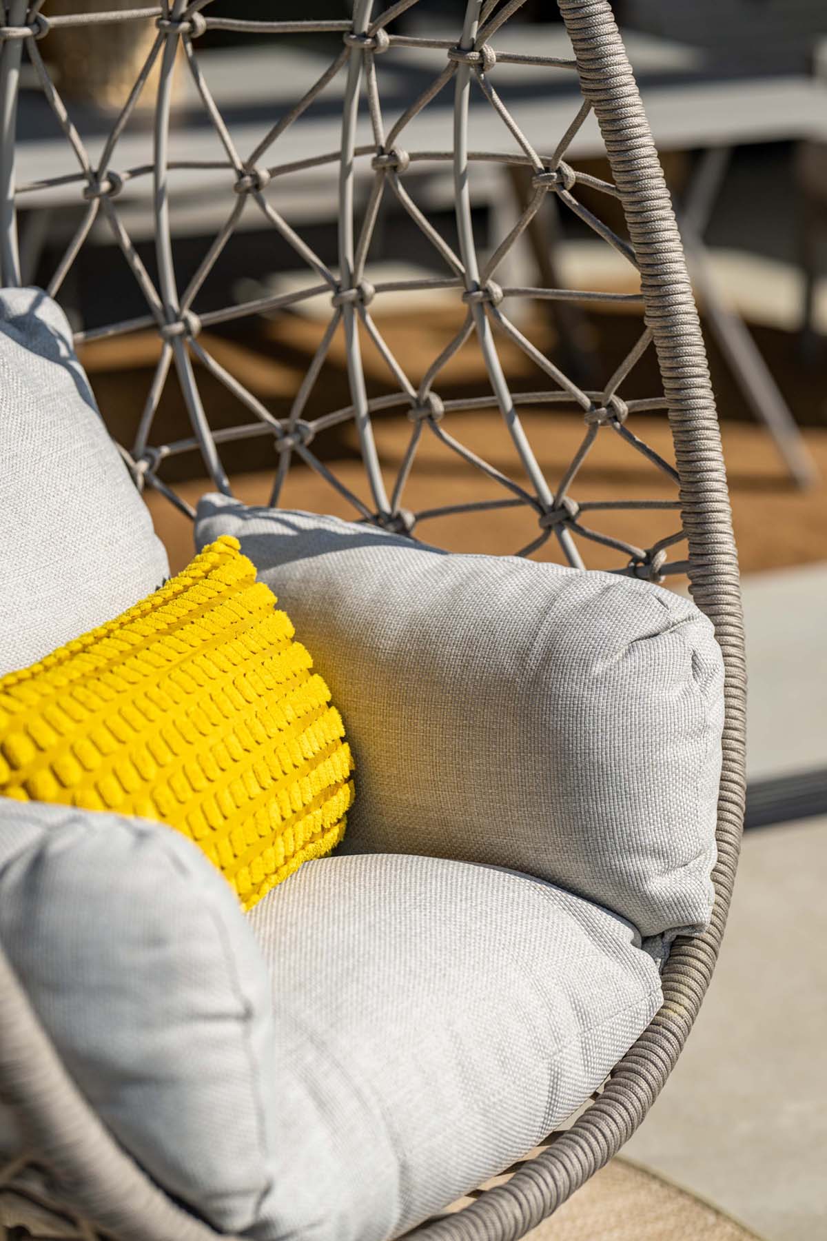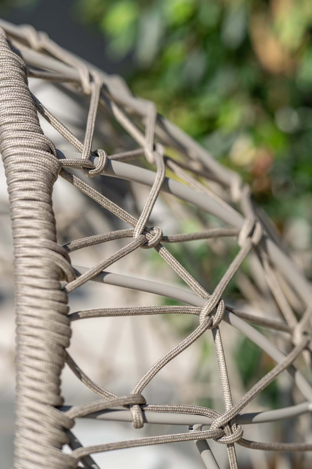 De hangstoel heeft een stevig aluminium frame en is omhuld met ‘Qualicord’ touw, een draad van solution dyed polyester. Dit materiaal is sterk, kleurvast en bestand tegen verschillende weersinvloeden, waardoor de stoel duurzaam en praktisch in gebruik is.