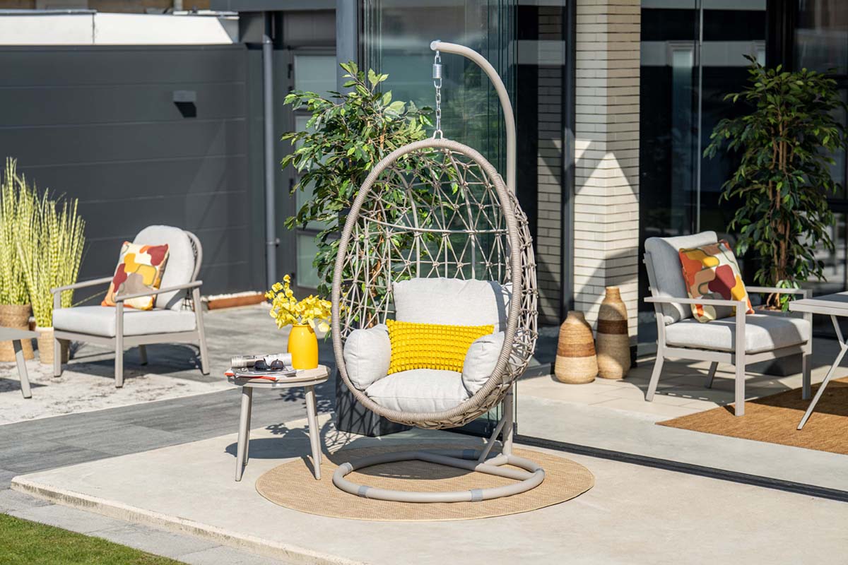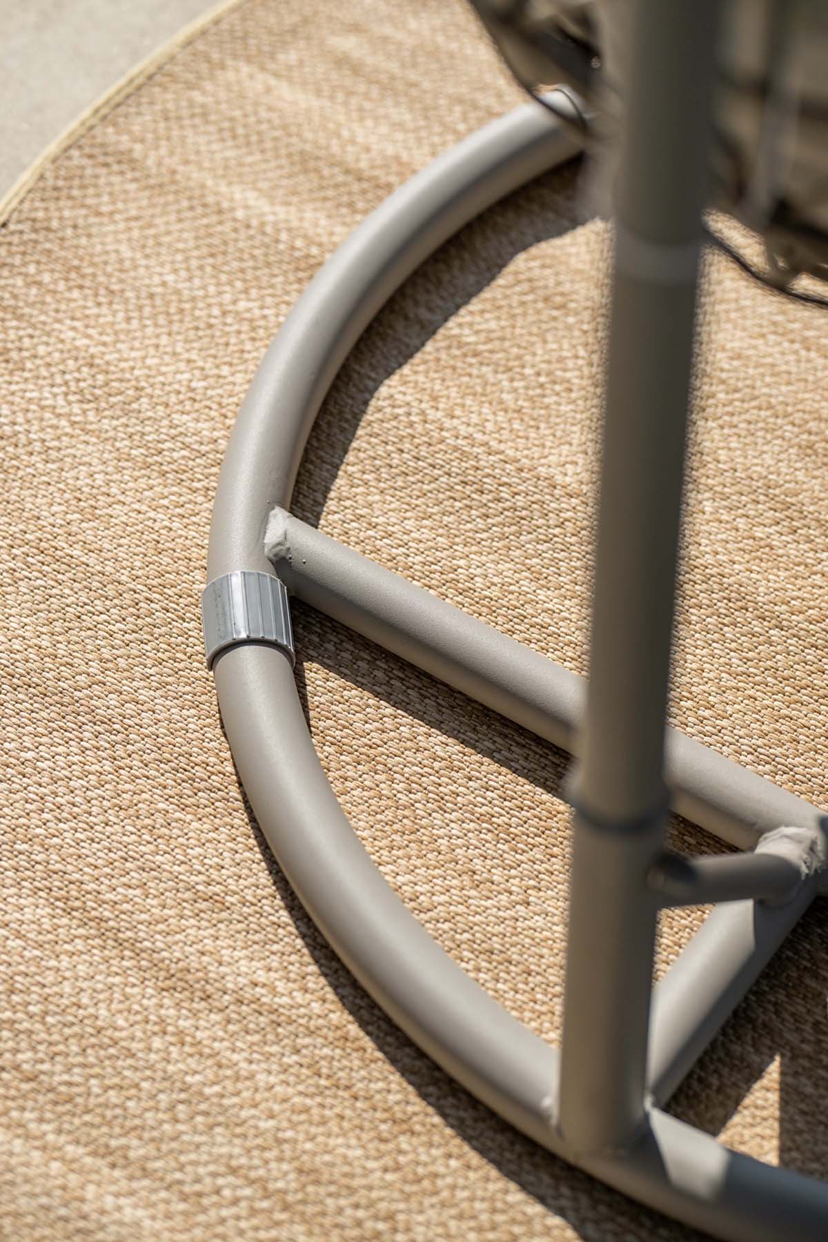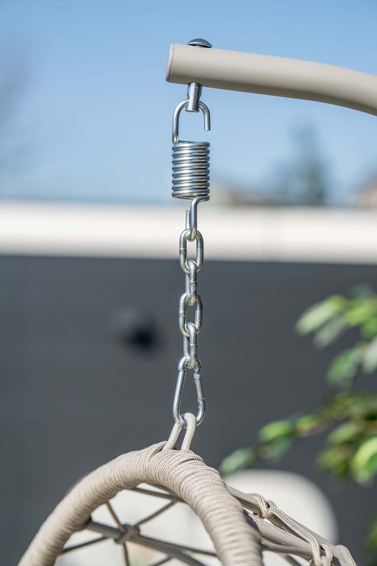 Het robuuste staalframe, waaraan de hangstoel hangt, is afgewerkt met een beschermende poedercoating voor extra stevigheid en weerbestendigheid.